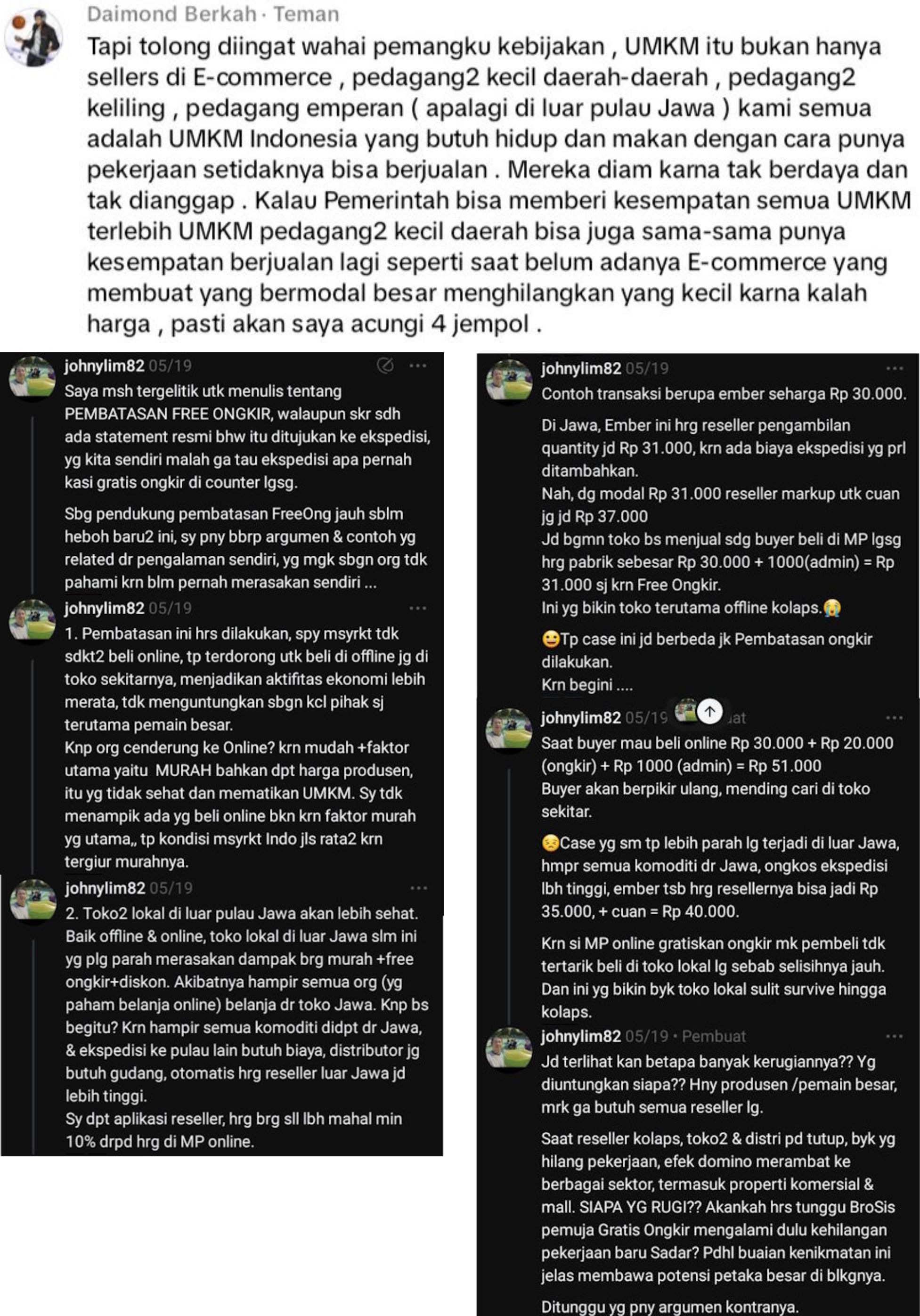- Platform Online yang kuat ‘bakar duit’ (kuat beri Free-Ongkir) bisa mematikan Platform-Platform Online yang lain yang tidak kuat ‘bakar duit’ (tidak kuat beri Free-Ongkir). Contohnya : Shopee yang kuat ‘bakar duit’ mematikan BliBli yang tidak kuat ‘bakar duit’. Oleh karena itu, larangan bagi semua Platform Online untuk memberi Free-Ongkir & wajib mengenakan biaya Ongkir itu sebenarnya juga akan menyehatkan persaingan antara sesama Platform Online vs Platform Online.