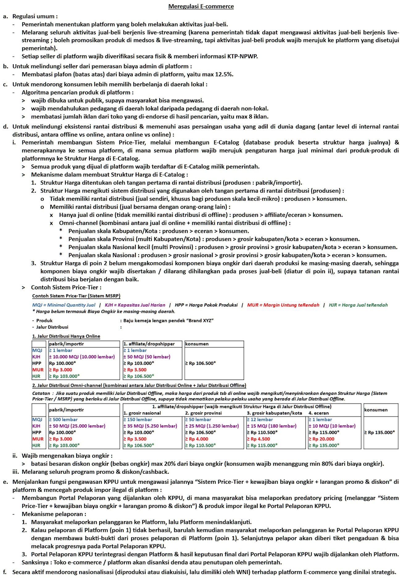 - Kita perlu mengutamakan prinsip keselamatan rakyat dibanding prinsip pasar bebas. Dan dalam konteks perdagangan E-commerce yang bebas hambatan (tanpa hambatan fisik & tanpa hambatan informasi), kalau kita membiarkan terjadi persaingan yang tidak sehat (Predatory-Pricing karena melanggar Sistem Price-Tier) di perdagangan E-commerce, maka efek merusaknya akan jauh lebih besar (berskala nasional) & menyebabkan kerusakan ekonomi secara nasional.